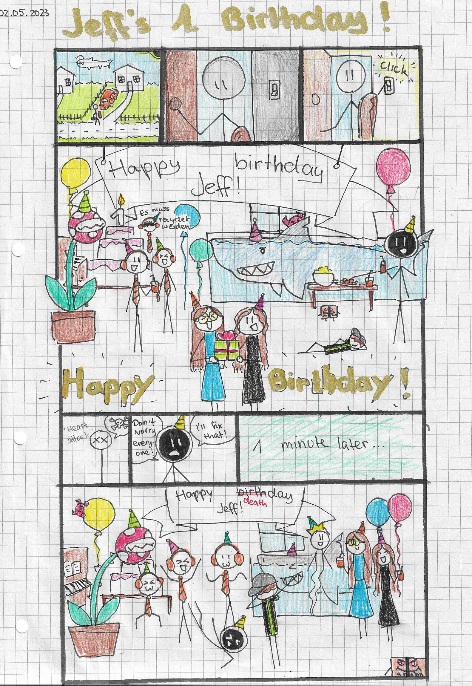 Seit dem 2. Mai 2022 gibt es in der Klasse 7f ein Maskottchen: Jeff. Zwei Mädchen aus der 7f haben diesen Comic erfunden. Was eigentlich nur als Spaß gedacht war, wurde damals in der Klasse sehr populär und ist es auch heute noch. Die zwei Mädchen hatten damals die Idee und haben selbst lustige Geschichten erfunden, gezeichnet und geschrieben. Seit mittlerweile ca. einem Jahr existiert Jeff und am 2. Mai 2023 (seinem Geburtstag) wurde der 10. kleine Comic geschrieben. Jeff-Comic ist ein farbiger Comic (oft auf Englisch), der von einem Strichmännchen namens Jeff handelt, der immer wieder stirbt aber wiederbelebt wird: „Jeff’s adventures“.