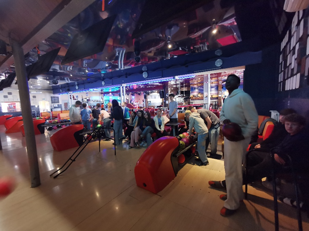 wobei jeweils Pärchen gebildet wurden. Dabei wurden alle etwas nass, was den Einen mehr störte als den Anderen.  Eine Schülerin startete sogar eine Wette mit Herrn Juchem, rutschte aber auf einer algenbesetzten Stufe aus und landete unverletzt im knietiefem Wasser. Anschließend gingen wir am späten Nachmittag zum Bowlen, was sich zu einem aufgeheiztem Wettkampf entwickelte.