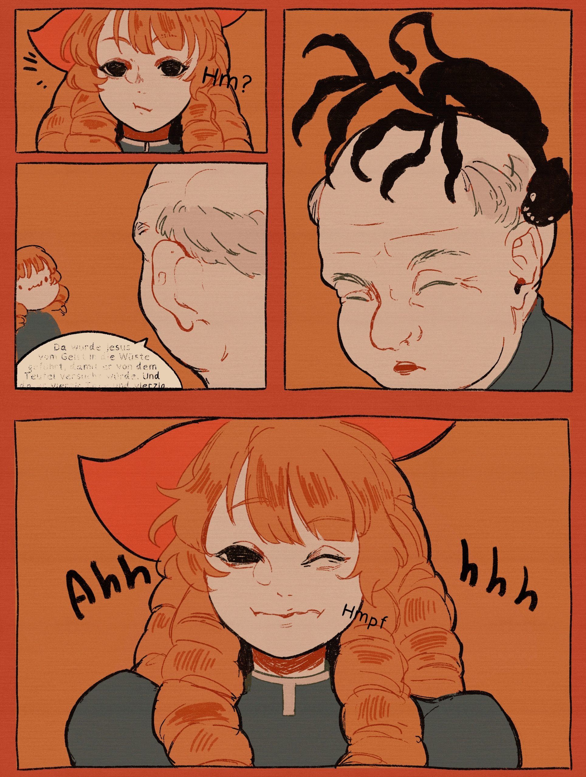 Ich möchte aber auch darauf hinweisen, dass die Geschichte in vielerlei Weisen interpretiert werden kann und die Künstlerintentionen nicht leicht zu erkennen sind. Ich persönlich frage mich beispielsweise, was genau die allgemeine Thematik ist und was kritisiert wird. (Inwieweit wird hier aktiv die Kirche bzw. der katholische Glaube angegriffen?)