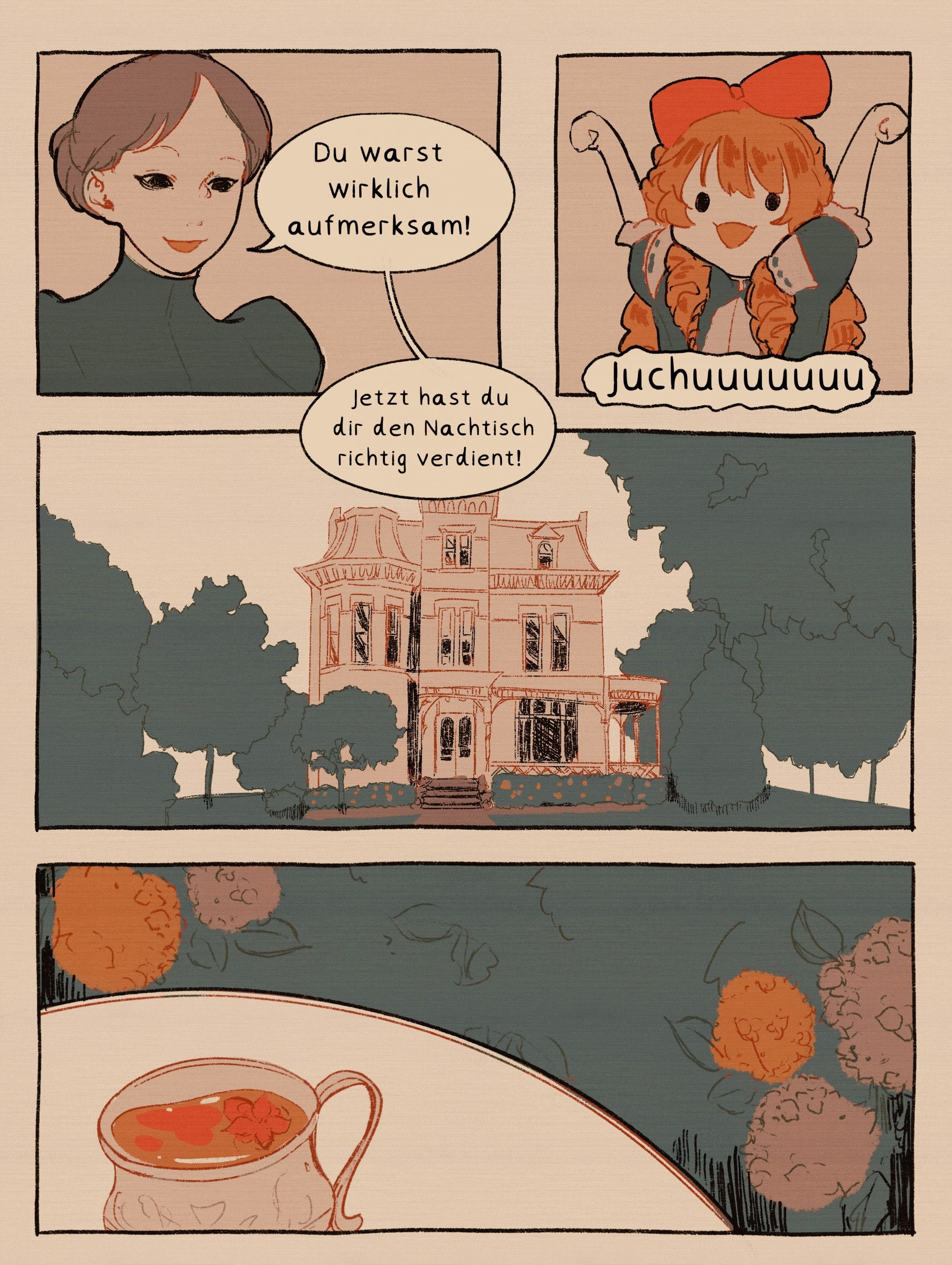 Zuerst finde ich es wirklich beeindruckend, wie detailreich und schön gestaltet die Zeichnungen und der ganze Comic ist! Lob und Respekt an die talenrierte Künstlerin! 🙂